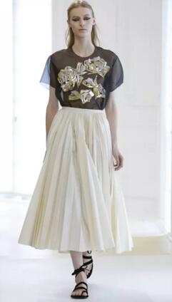 迪奧套裝(Bar Suit)作為迪奧品牌的精髓,成為本季的設計主線而不斷被強調(diào)。如今,設計靈感在原有的基礎上不斷突破,迪奧套裝的標志廓形:沙漏型的外套和超大裙擺,再次被運用到本季設計中,而強烈對比的黑白兩色也成為本季的色彩基調(diào)。