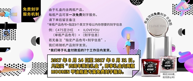 小奧汀攜手Moomin推出四周年限量禮盒,每個(gè)禮盒中含有兩款Moomin合作款指甲油,除了時(shí)髦的顏色,環(huán)保的指彩,獨(dú)具匠心的設(shè)計(jì)包裝,還可以在甲油瓶上篆刻自己的心意,免費(fèi)體驗(yàn)專屬刻字服務(wù)!這份獨(dú)一無(wú)二的體驗(yàn),也是小奧汀感謝這四年來(lái),你對(duì)它們獨(dú)一無(wú)二的恩寵。