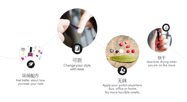 完全水性的小奧汀和市面上一般的指甲油,最大的差別就是它不是油性的,對(duì)指甲絕無(wú)腐蝕,無(wú)滲透,也無(wú)添加,完全靠樹(shù)脂本身的抓力來(lái)附著在指甲表面。將干透的小奧汀從指甲上輕輕一剝,甲油層隨即脫落,立即免去卸甲水長(zhǎng)期對(duì)指甲的嚴(yán)重傷害,天天都能隨心所欲,隨著造型和心情的變換,換上新鮮的甲油顏色。與其它可剝甲油品牌相比,小奧汀的牢固性與安全性無(wú)可比擬,而色彩飽滿度和光澤也更勝一籌。