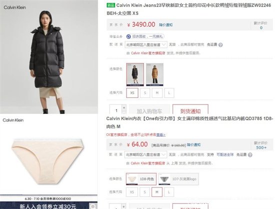 ck家最貴的就是中長款鴨絨絎縫羽絨服ZW02246了,一件要價3490元;而它家的女士滿印棉質性感透氣比基尼內褲QD3785,一件64元。