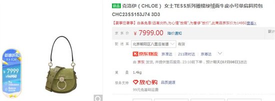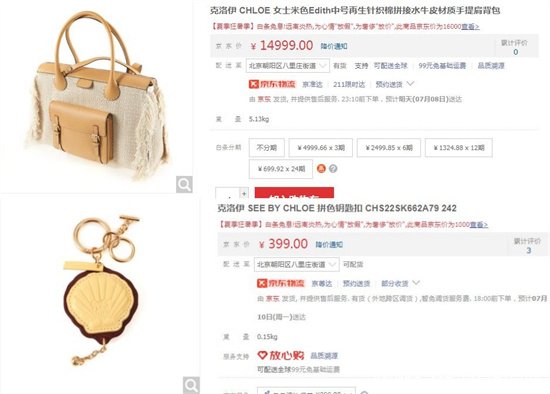chloe家最貴的是女士米色Edith中號,售價14999元;而它家最便宜的是拼色鑰匙扣CHS22SK662A79,一個399元。