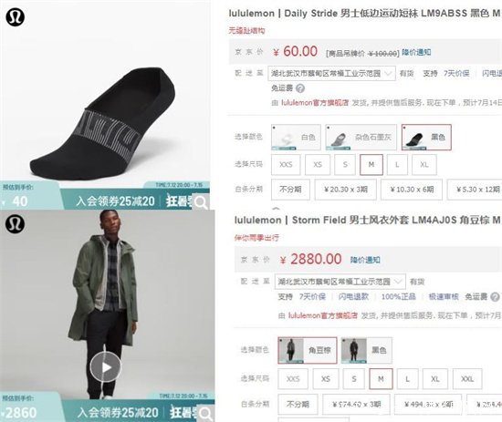露露lemon家最便宜的是Daily Stride男士低邊運動短襪,一雙襪子要60元。而最貴的是這件Storm Field男士風衣外套,一件高達2880元。