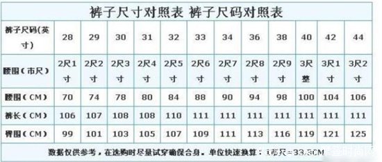 如果褲子處于28尺帶30尺或者是44尺的時候,你就可以來參考一下這張28尺到44尺的粗略對照表,一般來說1市尺就是33.3cm,你也可以根據自己的腰圍來換算了。