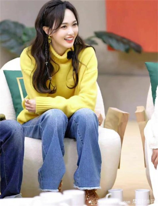唐嫣的這套黃色與藍色的搭配中,高領的明黃色毛衣就顯得非常溫柔,同時牛仔褲還有一種青春活潑的感覺,是一套比較減齡的搭配。