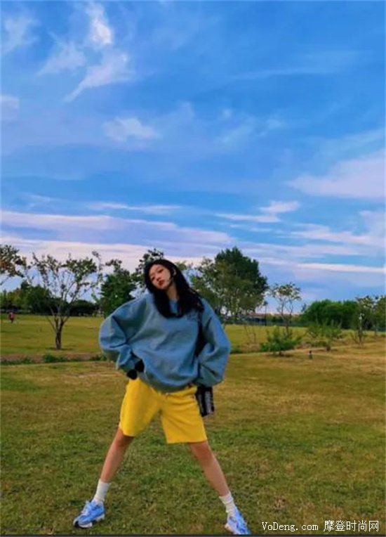 藍色的闊型衛衣與寬松的明黃色闊腿短褲的搭配,就顯得很有生活氣息,休閑范兒十足。同時這套組合穿搭,又能顯得孫千的身材非常高挑,還有一絲潮流味道。