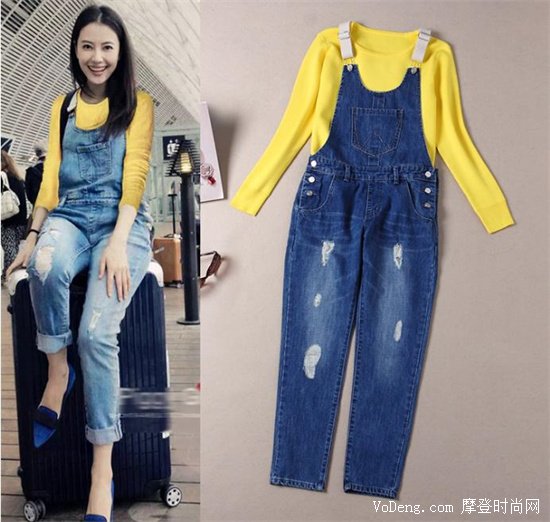 高圓圓的這套黃色與藍色的穿搭,還是比較古早的。但是黃色的緊身上衣、藍色的破洞牛仔褲穿在她的身上,就顯得高圓圓非常年輕有活力。