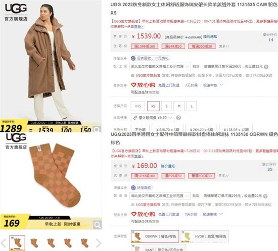ugg價格最高的是瑞安儂長款羊羔絨外套1131535,要1539元;而最便宜的徽標款棋盤格休閑短襪1135130,只要169元。