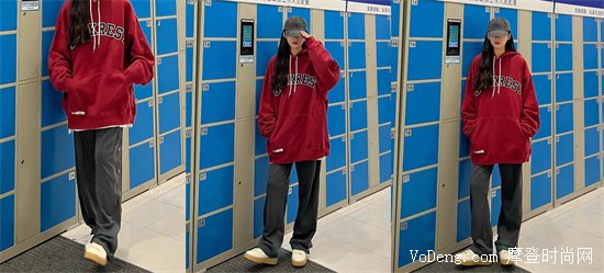 灰色的休閑褲與紅色的衛衣搭配起來就非常青春了,給人一種運動風的感覺。松弛的休閑褲與紅色衛衣的搭配,也能顯得你有種松弛的慵懶范兒,整體的組合也是非常耐看的。