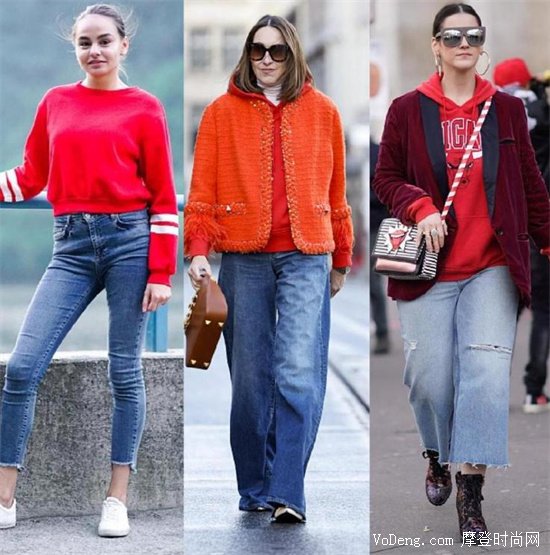 紅色與藍色的組合,本來就是種比較時髦的的搭配。而紅色衛衣與藍色牛仔褲的搭配,風格就比較百變。你可以是運動達人,也可以是時髦博主,也可以是奢華貴婦……