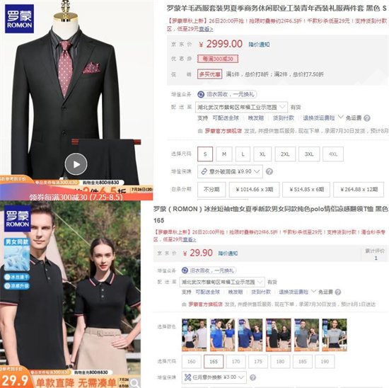 羅蒙家最貴的是羊毛西服套裝男夏季商務西裝禮服兩件套,要2999元;而最便宜的是冰絲短袖t恤女夏季新款男女同款,只要29.9元。